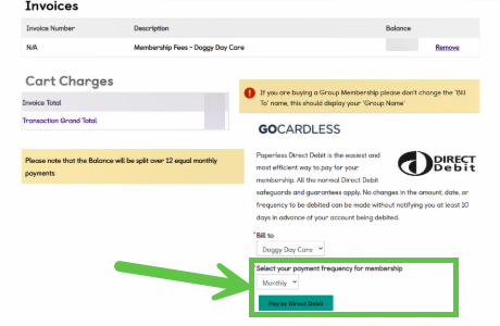 Step 7: The page will refresh by itself a couple of times, wait until you see the Go Cardless Direct Debit Screen shown below. Ensure you select ‘Monthly’ in the *Select your payment frequency for membership.*