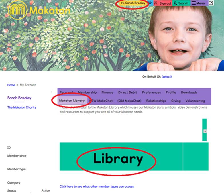 To find the Library click on your name in the top right hand corner, once logged in, and then to the Makaton Library tab on the purple bar, and make sure you then click on the green Library button.